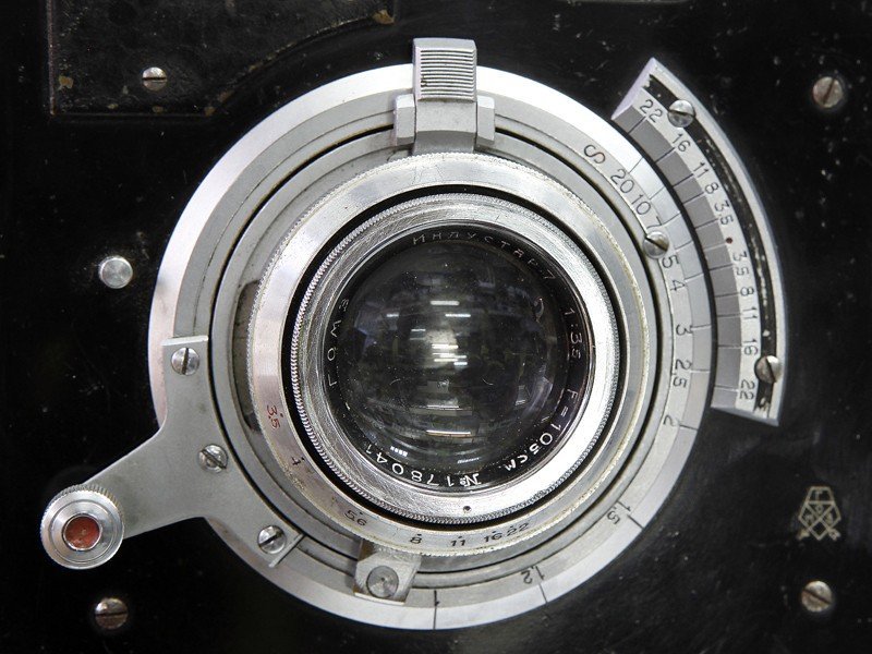 На фотографии виден маленький черный предмет прямоугольной формы. Это очень темно-синее стекло, является фильтром, одевающимся на видоискатель. Слабая светопропускная способность фильтра говорит о том , что можно через него смотреть на солнце! Возможно этот фильтр использовался при съемке работающих сталеваров . Никогда раньше не видел даже на картинках такой принадлежности к Репортеру.