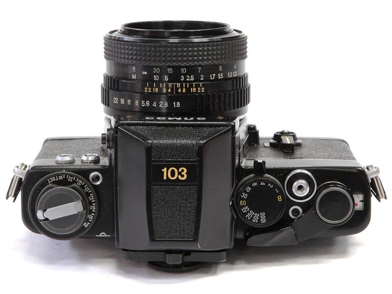 В этой моделе Алмаз-103 под пентапризмой нацарапано слово АЛМАЗ. /в предыдущей модели нет/, два синхроконтакта, кольца на спусковой кнопке блестящие, цвет корпуса черный, номер сзади стал семизначным.